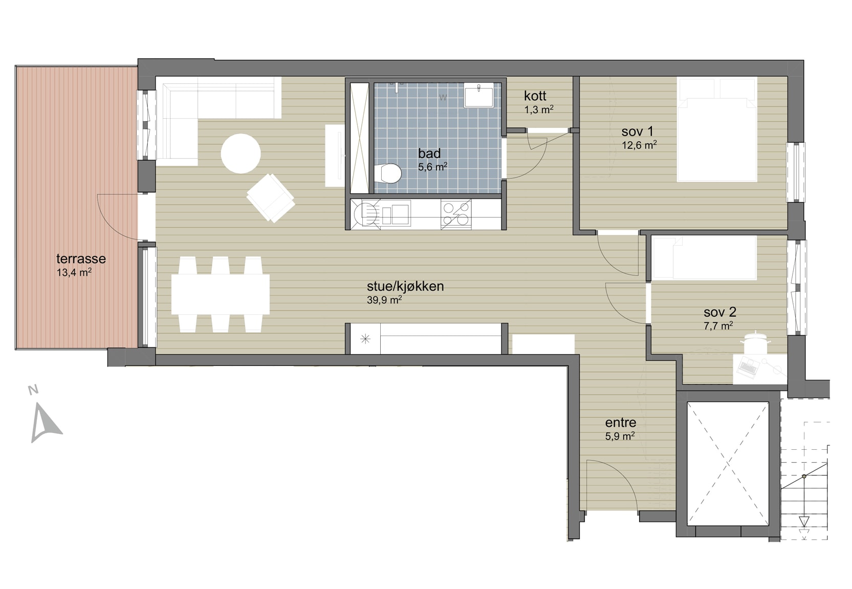 3-roms leiligheten har ekstra god takhøyde i stuen/kjøkken. Fra 2,8 til 3,45 meter.