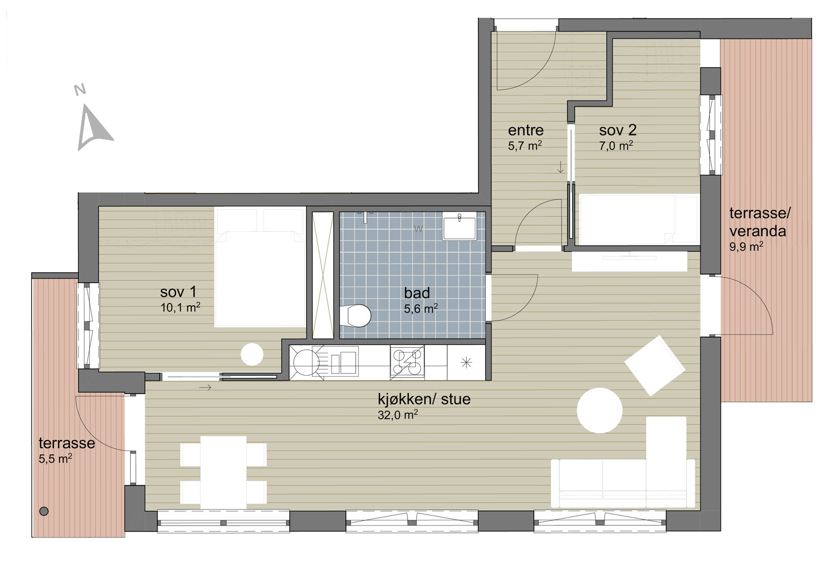 3-roms leiligheten har ekstra god takhøyde i stuen/kjøkken. Fra 2,7 til 4,3 meter. Ta kontakt med megler for mer info.